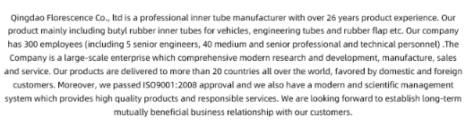 Our main products are butyl inner tubes and natural inner tubes for more than 170 sizes, including inner tubes for passenger car, truck, AGR, OTR, industry, bicycle, motorcycle and flaps for industry and OTR. The annual output is about 10 million sets. Passed International quality system certifictation of ISO9001:2000 and SONCAP, our products are half exported, and the mainly markets are Europe(55%), South-East Asia(10%), Africa(15%), North and South America(20%).